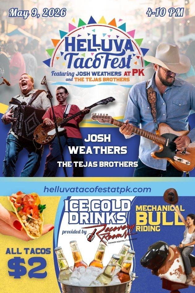Helluva Taco Fest at PK is the ultimate celebration for taco enthusiasts from near and far! Join us this May for mouthwatering tacos, ice-cold beverages, and live music from Josh Weathers and The Tejas Brothers. Tickets are going fast, so grab yours today. This is one fiesta you won’t want to miss!